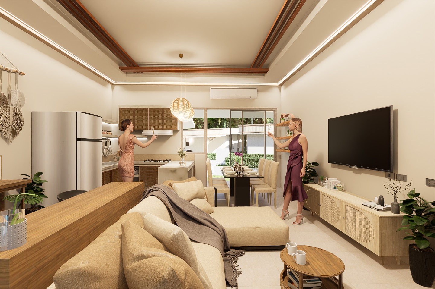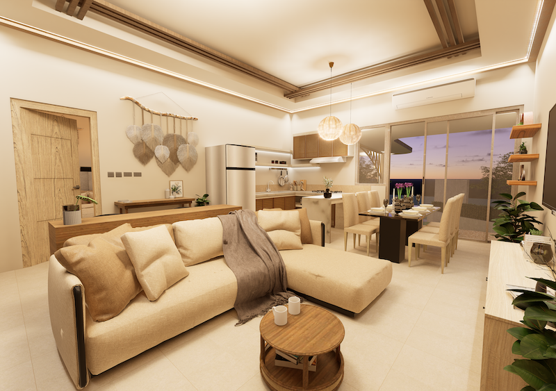 • Living Space: The open-plan layoutincludes a generous living room, a large kitchen counter, and a dining area ideal for entertaining family and friends. The design promotes social interaction and comfortable living.